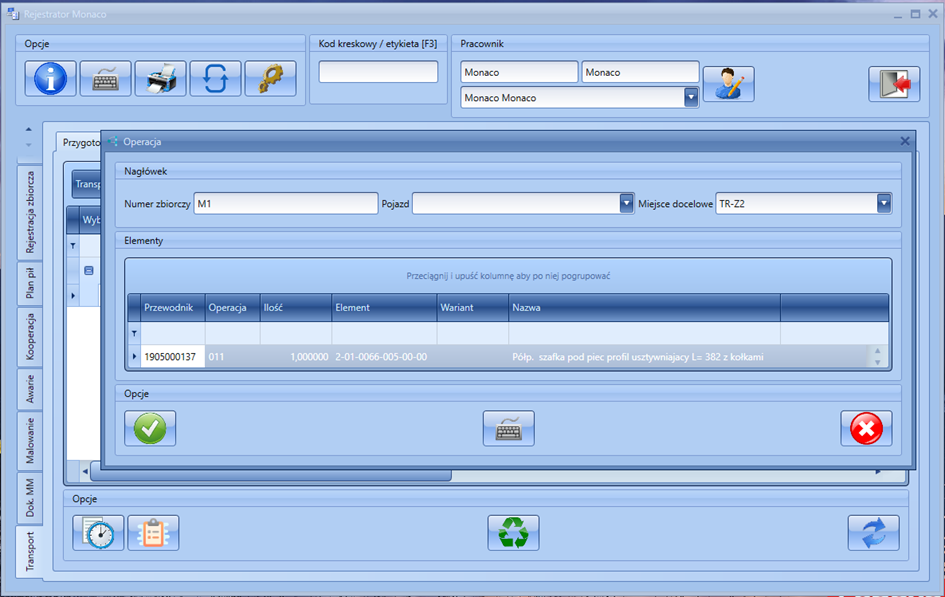 Aplikacja ułatwia korzystanie z zasobów systemu MONACO® na stanowisku produkcyjnym. Może być użytkowana na pulpicie komputera stacjonarnego lub pulpicie dotykowym typu All-in-One (komputer z ekranem dotykowym w jednej obudowie). Aplikacja jest ciągle udoskonalana, stosownie do bieżących potrzeb użytkowników. W ostatnim czasie (w wersji 19.6) udostępniono użytkownikom możliwość dodawania operacji transportu na przewodnikach warsztatowych. Operacja ta […]