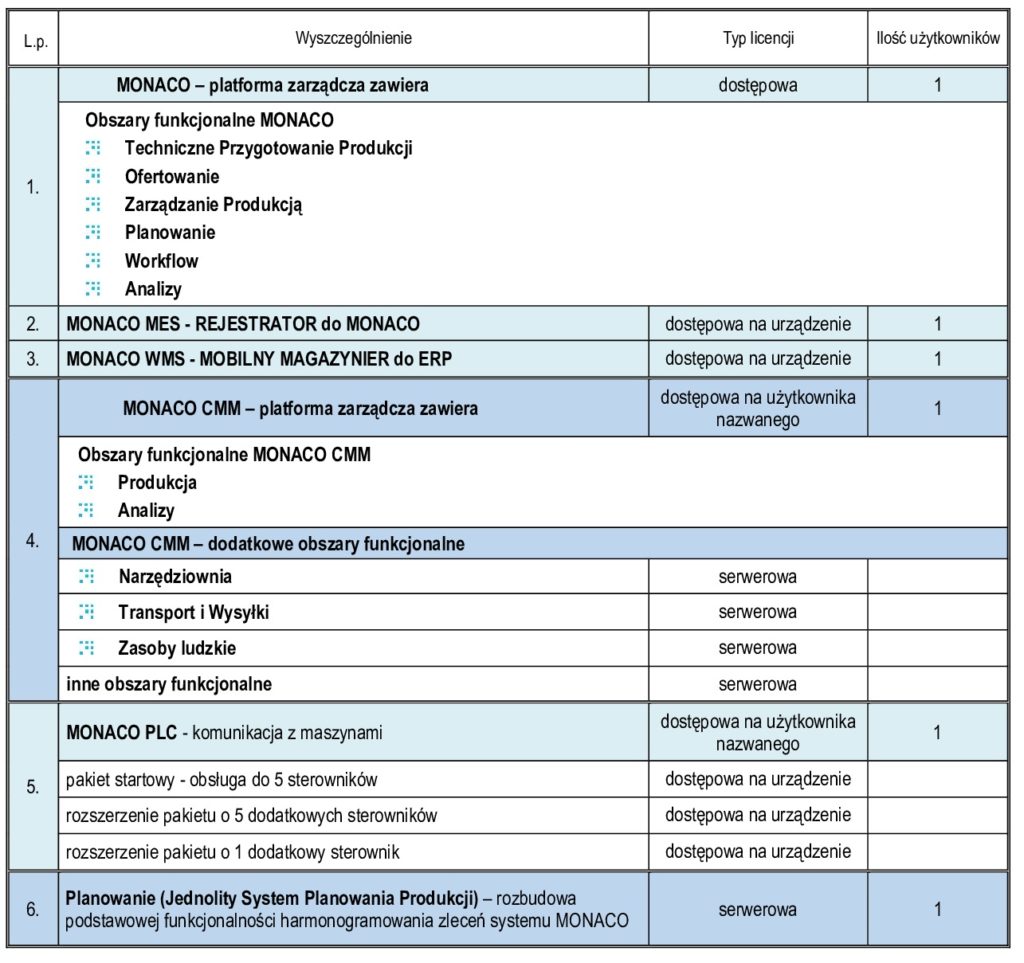Licencja na obszary funkcjonalne to dostęp do obszaru funkcjonalnego MONACO CMM, MONACO PLC. Liczba użytkowników jest określana na podstawie ilości licencji dostępowych do platformy zarządczej.